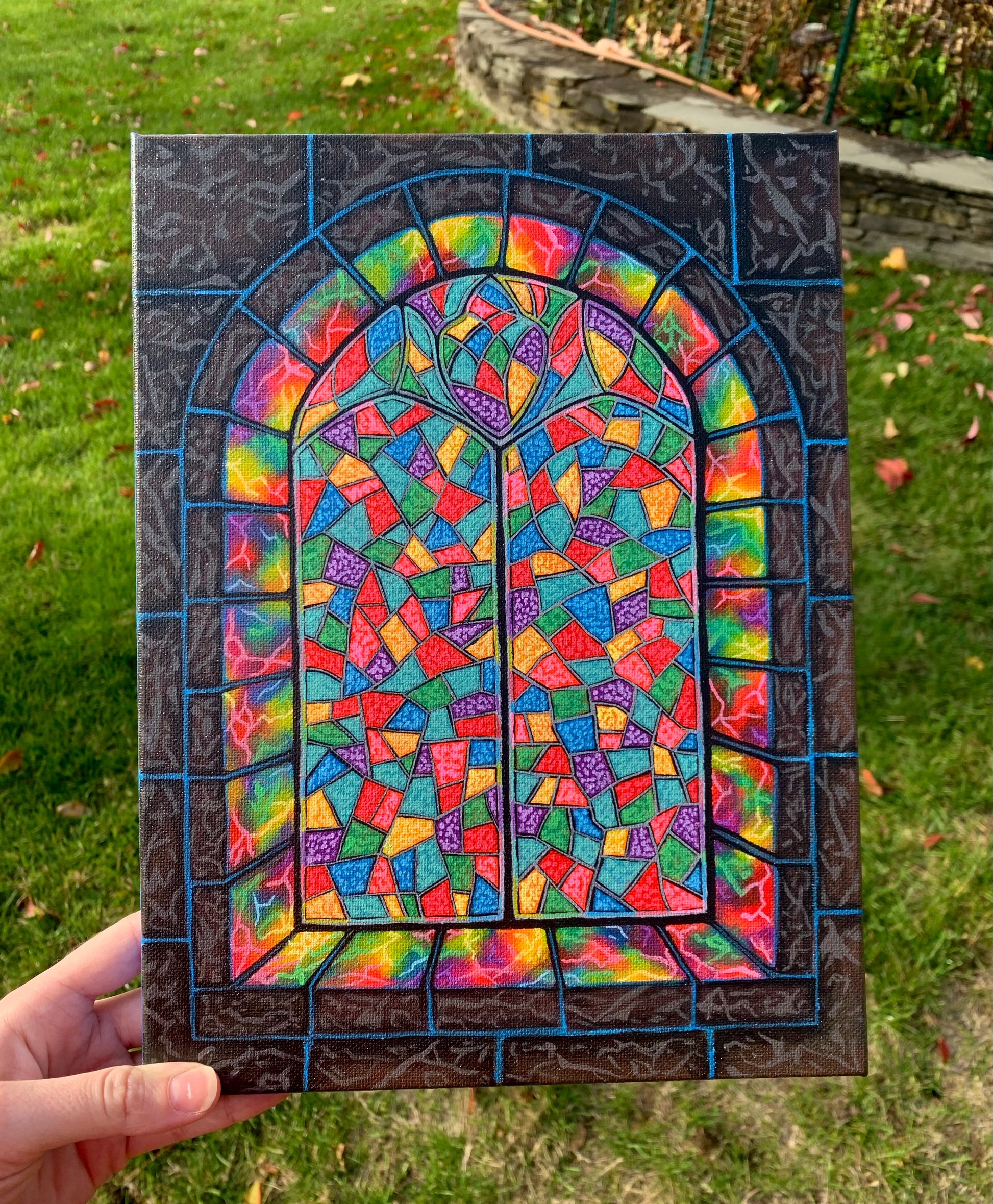 This 9”x12” original acrylic painting depicts a glowing stained glass window inside a mystical stone castle. Imagine living within a realm of magic where dragons and princesses rule the land. You are walking down a spiral stairwell in a gorgeous gown. The scent of fresh baked goods lingers in the air as you head to the dining room to grab some breakfast. That’s when you notice the morning sun glows through this rainbow window, offering a beautiful start to your day.